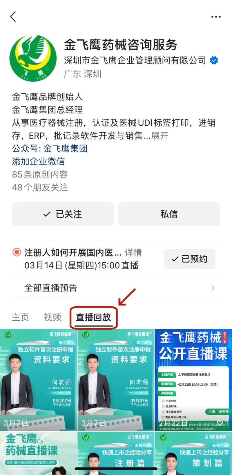 往期直播培訓課程支持回放,關(guān)注“金飛鷹藥械咨詢服務”視頻號并點擊視頻號主頁,即可查看“直播回放”哦~