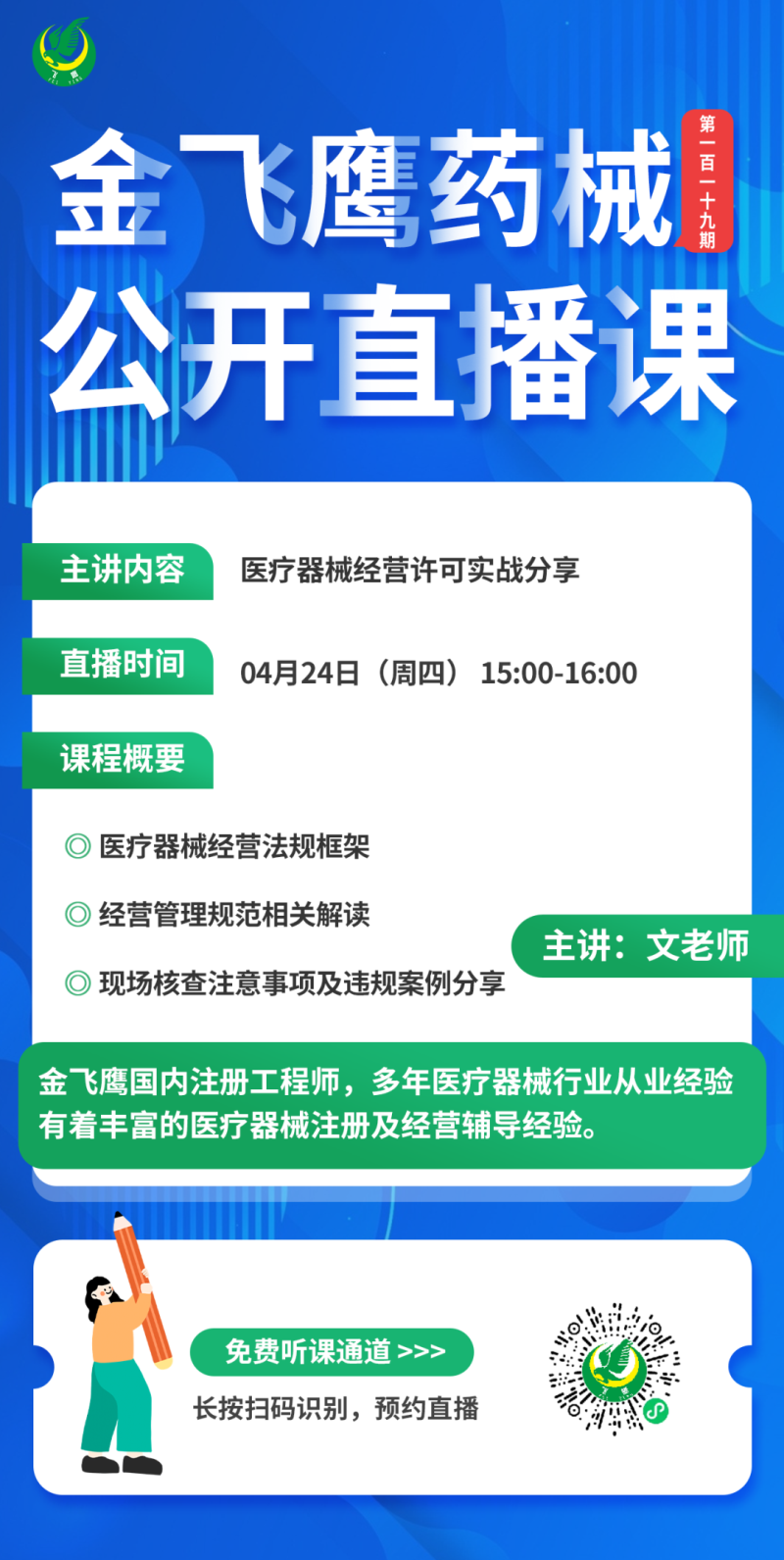金飛鷹直播培訓(xùn),是每周一次的固定培訓(xùn)欄目,優(yōu)選金飛鷹國內(nèi)外資深注冊/項(xiàng)目老師定期為大家講解醫(yī)療器械注冊相關(guān)知識,解答大家在醫(yī)療器械注冊過程中的諸多疑問。