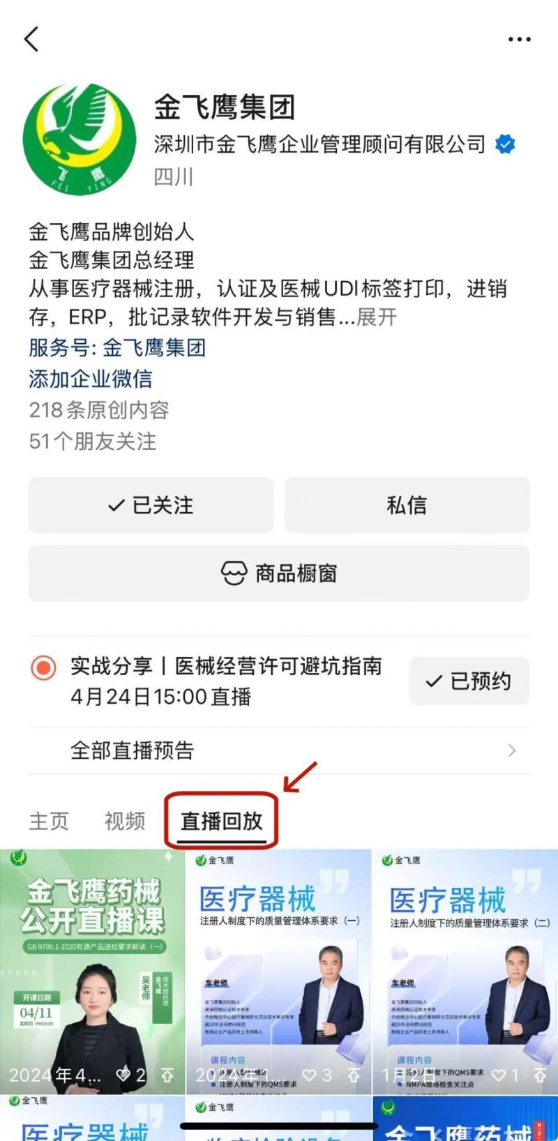 往期直播培訓(xùn)課程支持回放,關(guān)注“金飛鷹藥械咨詢服務(wù)”視頻號并點(diǎn)擊視頻號主頁,即可查看“直播回放”哦~