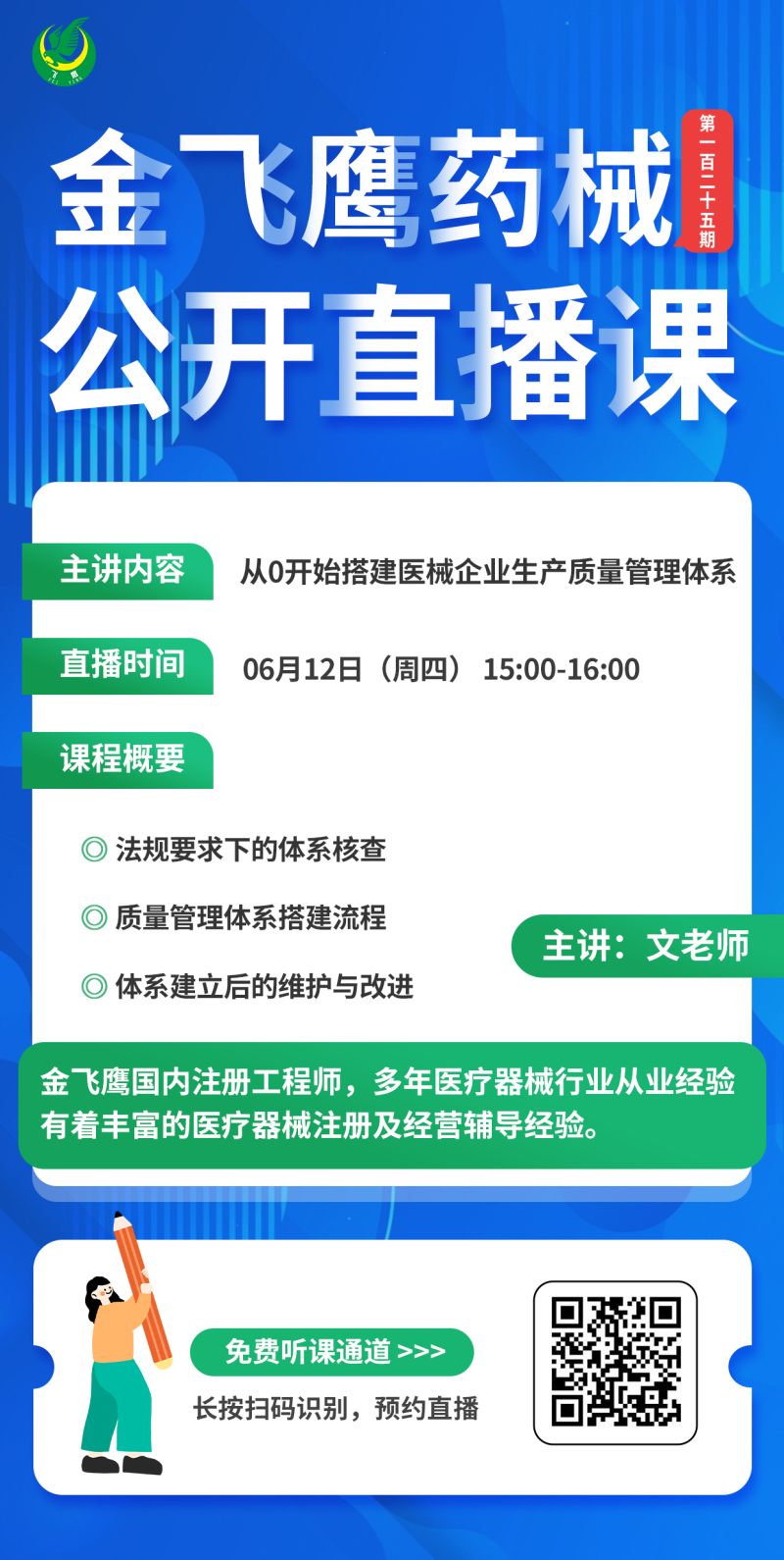 6月12日下午3點(diǎn),金飛鷹國(guó)內(nèi)注冊(cè)工程師、有著豐富醫(yī)療器械注冊(cè)及經(jīng)驗(yàn)輔導(dǎo)經(jīng)驗(yàn)的文老師給大家?guī)?lái)《從0開始搭建醫(yī)械企業(yè)生產(chǎn)質(zhì)量管理體系》,感興趣的朋友記得提前預(yù)約,我們直播間不見不散~