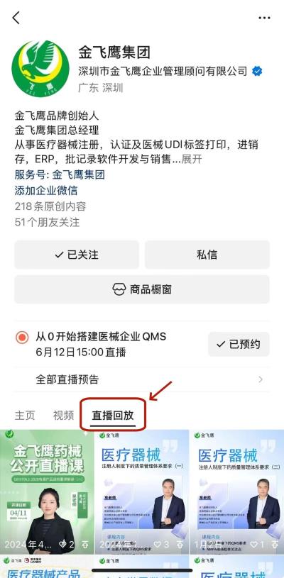 往期直播培訓(xùn)課程支持回放,關(guān)注“金飛鷹藥械咨詢服務(wù)”視頻號(hào)并點(diǎn)擊視頻號(hào)主頁(yè),即可查看“直播回放”哦~