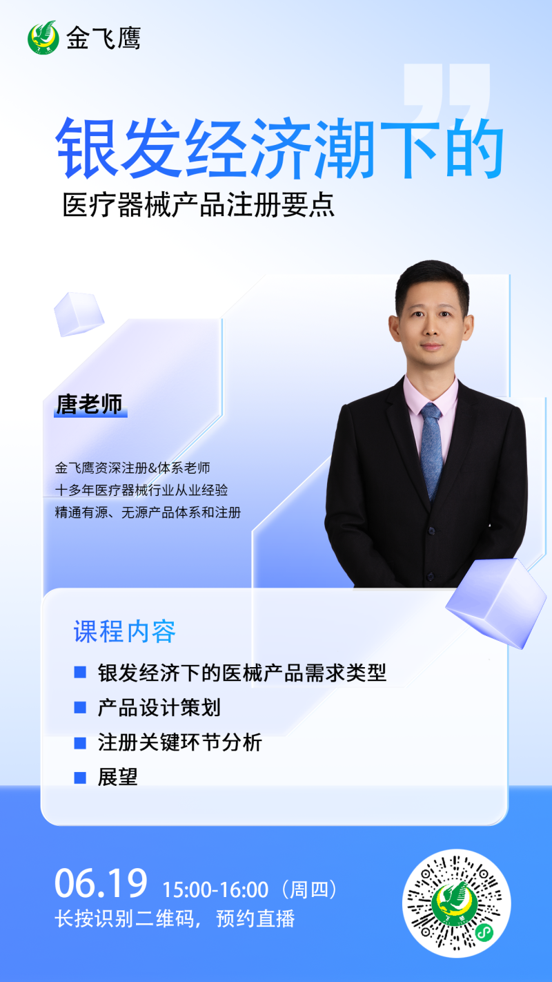 6月19日下午3點,有著十多年醫(yī)療器械行業(yè)從業(yè)經(jīng)驗、精通醫(yī)療器械產(chǎn)品注冊及體系輔導(dǎo)的唐老師給大家?guī)怼?/span>銀發(fā)經(jīng)濟浪潮下的醫(yī)療器械注冊要點》,感興趣的朋友記得提前預(yù)約,與我們一起解鎖“銀發(fā)經(jīng)濟”產(chǎn)品注冊全流程優(yōu)化方案~