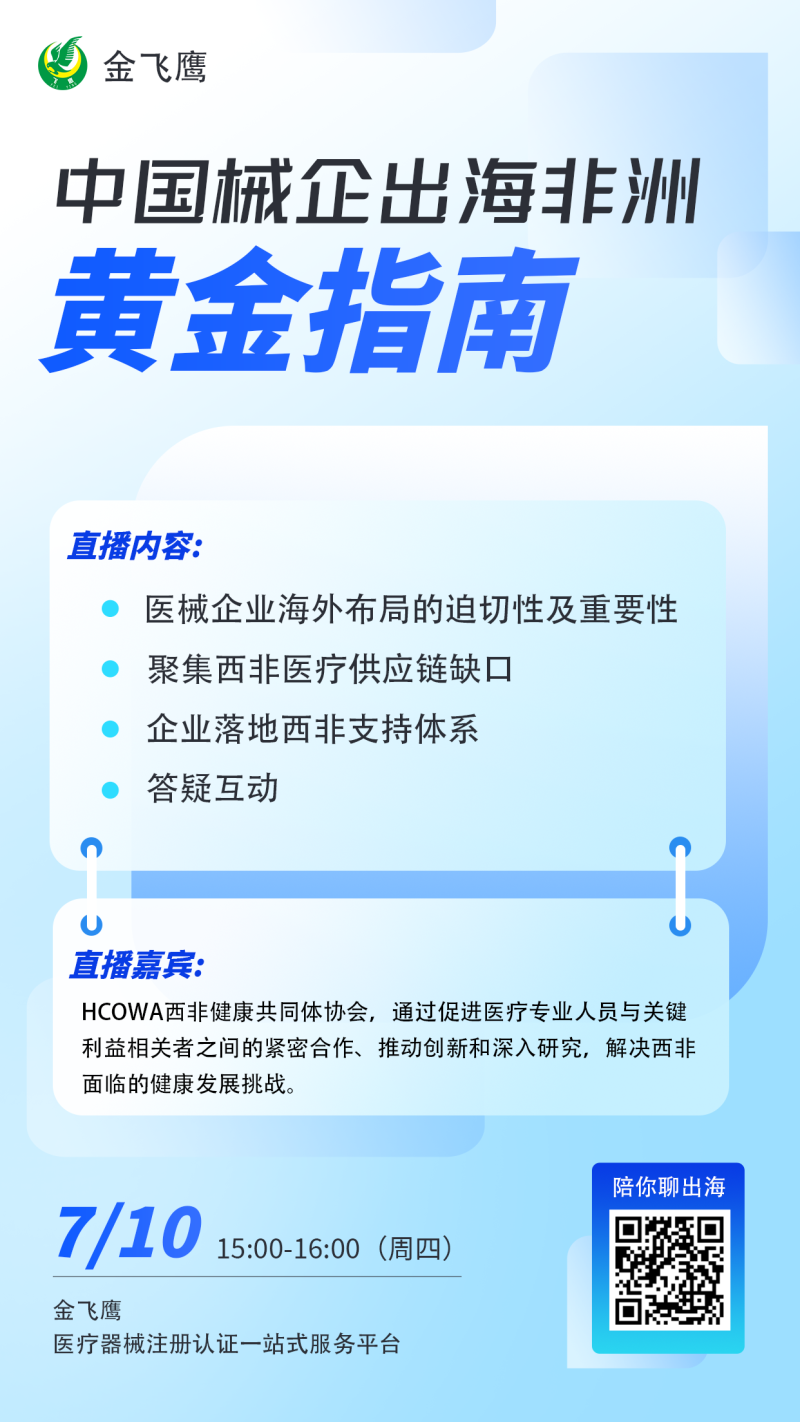 在此背景下,7月10日下午3點(diǎn),我們特別聯(lián)合HCOWA西非健康共同體協(xié)會(huì),給大家?guī)?lái)一場(chǎng)中國(guó)械企出海非洲指南的直播,為您解鎖西非醫(yī)療市場(chǎng)的財(cái)富密碼!本期直播將從西非醫(yī)療市場(chǎng)需求、西非供應(yīng)鏈缺口、企業(yè)落地西非的相關(guān)支持體系等方面進(jìn)行分享,與各位共拓西非的掘金版圖,感興趣的朋友記得提前預(yù)約!