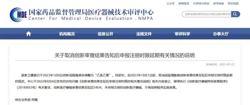 近日,國(guó)家藥監(jiān)局器審中心發(fā)布《關(guān)于取消創(chuàng)新審查結(jié)果告知后申報(bào)注冊(cè)時(shí)限延期有關(guān)情況的說(shuō)明》,其中指出,自2023年10月1日起,取消因疫情影響創(chuàng)新審查結(jié)果告知后申報(bào)注冊(cè)時(shí)限延期的規(guī)定。該中心于2022年8月4日發(fā)布的共性問(wèn)題《創(chuàng)新審查結(jié)果告知后申報(bào)注冊(cè)時(shí)限的相關(guān)情況說(shuō)明》相關(guān)內(nèi)容(即“對(duì)于有充分證據(jù)證明確因疫情影響導(dǎo)致注冊(cè)申請(qǐng)延誤的項(xiàng)目,上述時(shí)限可適當(dāng)延長(zhǎng),最長(zhǎng)不超過(guò)2年”)廢止,繼續(xù)執(zhí)行《創(chuàng)新醫(yī)療器械特別審查程序》(2018年83號(hào))有關(guān)要求,創(chuàng)新醫(yī)療器械審查結(jié)果告知后5年內(nèi),未申報(bào)注冊(cè)的創(chuàng)新醫(yī)療器械,不再按照程序?qū)嵤彶椤?/strong>