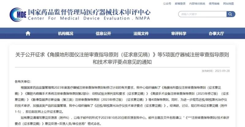 近日,國(guó)家藥監(jiān)局器審中心發(fā)布《近視/弱視激光治療儀技術(shù)審評(píng)要點(diǎn)(征求意見稿)》《腹腔內(nèi)窺鏡手術(shù)系統(tǒng)注冊(cè)審查指導(dǎo)原則第2部分:動(dòng)物試驗(yàn)決策判定和要求(征求意見稿)》等5項(xiàng)醫(yī)療器械注冊(cè)審查指導(dǎo)原則和技術(shù)審評(píng)要點(diǎn),并向社會(huì)公開征求意見。