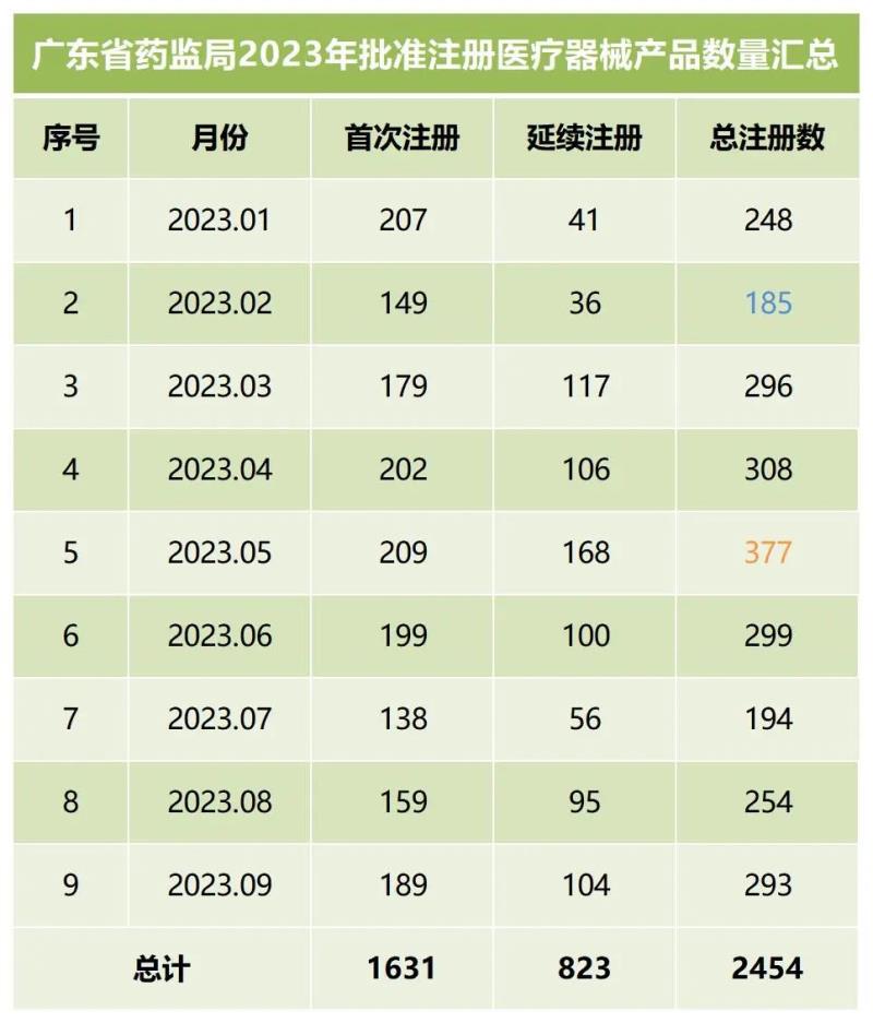 我們同步匯總了2023年各個(gè)月份廣東省藥監(jiān)局批準(zhǔn)注冊(cè)的醫(yī)療器械產(chǎn)品數(shù)量(見(jiàn)下方表格),從表格中可以看出,截至9月底,2023年廣東藥監(jiān)局總計(jì)批準(zhǔn)注冊(cè)第二類(lèi)醫(yī)療器械產(chǎn)品2454個(gè),其中首次注冊(cè)1631個(gè),延續(xù)注冊(cè)823個(gè)。
