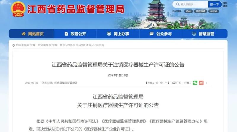 近日,江西省藥監(jiān)局發(fā)布公告稱,注銷江西美德智慧大健康科技有限公司等8家公司的醫(yī)療器械生產(chǎn)許可證,以下為具體明細(xì):