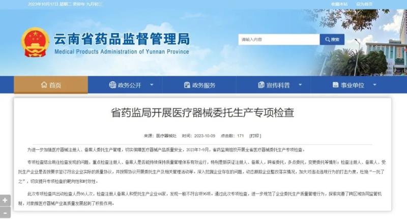 近日,云南省藥監(jiān)局官網(wǎng)發(fā)布動態(tài)稱,2023年7-9月,該局組織開展了全省醫(yī)療器械委托生產(chǎn)專項檢查。