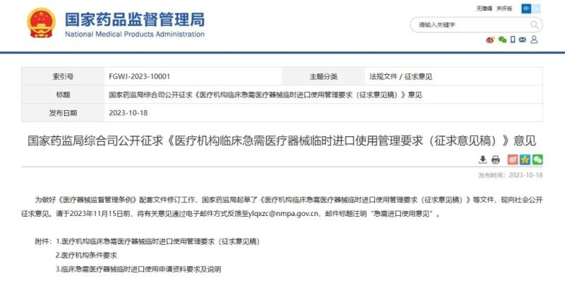 10月18日,國(guó)家藥監(jiān)局官網(wǎng)發(fā)布《醫(yī)療機(jī)構(gòu)臨床急需醫(yī)療器械臨時(shí)進(jìn)口使用管理要求(征求意見(jiàn)稿)》(以下簡(jiǎn)稱《管理要求》),并向社會(huì)公開(kāi)征求意見(jiàn)。
