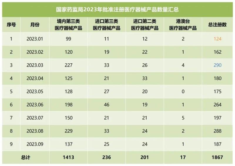 我們同步匯總了2023年各個月份國家藥監(jiān)局批準注冊的醫(yī)療器械產(chǎn)品數(shù)量(見下方表格),從表格中可以看出,截至9月,2023年國家藥監(jiān)局總計批準注冊醫(yī)療器械產(chǎn)品1867個,其中境內第三類醫(yī)療器械產(chǎn)品1413個,進口第三類醫(yī)療器械產(chǎn)品236個(第三類醫(yī)療器械產(chǎn)品總計1649個),進口第二類醫(yī)療器械產(chǎn)品201個,港澳臺醫(yī)療器械產(chǎn)品17個。