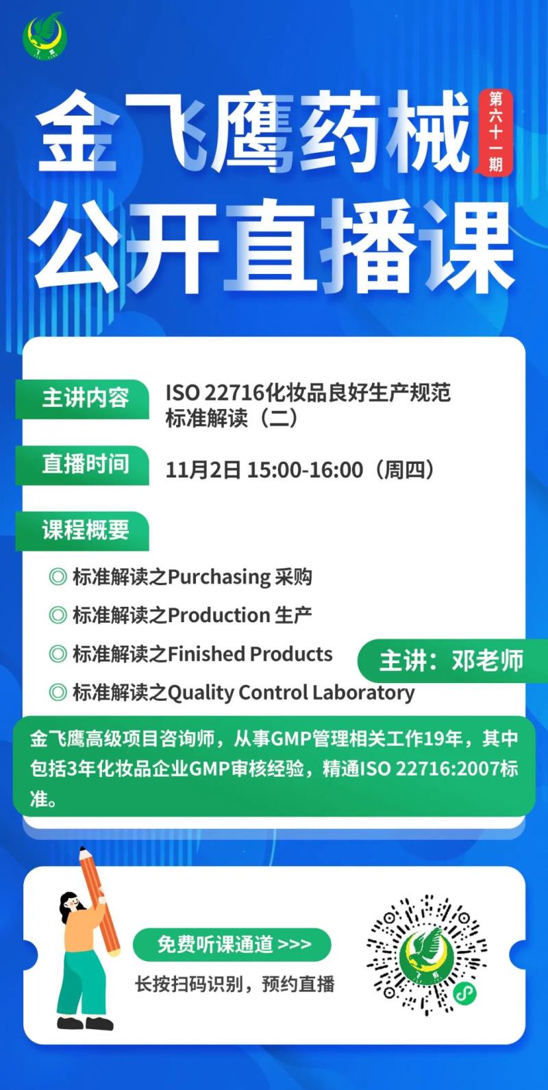 11月2日下午3點,金飛鷹高級項目咨詢師,從事GMP管理相關工作19年,其中包括3年化妝品企業(yè)GMP審核經驗的鄧老師,給大家?guī)?/span>《ISO 22716化妝品良好生產規(guī)范標準解讀(二)》,繼續(xù)給大家詳細解讀標準的采購、生產、成品、外包、投訴和召回等版塊,大家千萬不要錯過了哦!