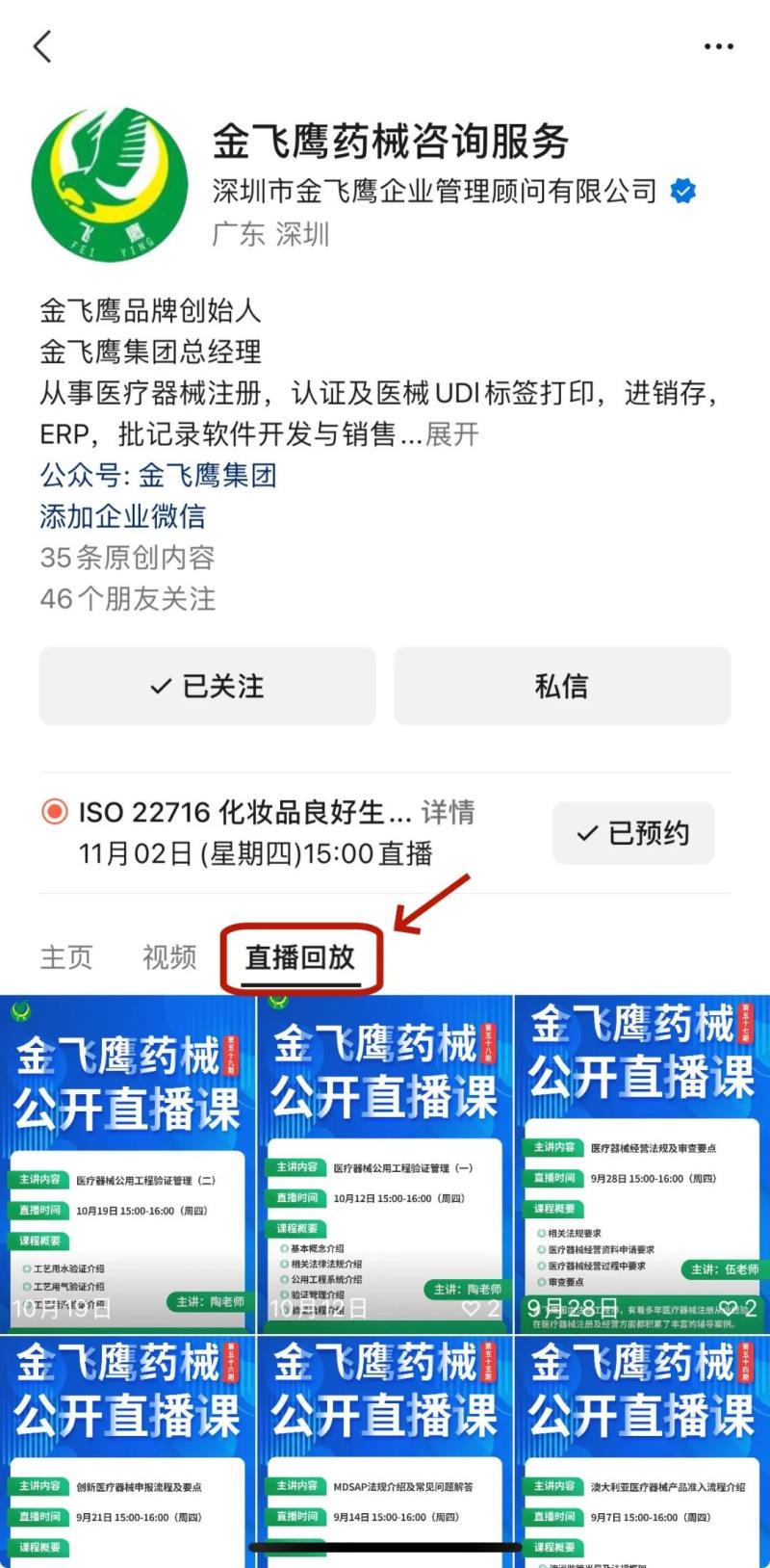 往期直播培訓課程支持回放,關注“金飛鷹藥械咨詢服務”視頻號并點擊視頻號主頁,即可查看“直播回放”哦~