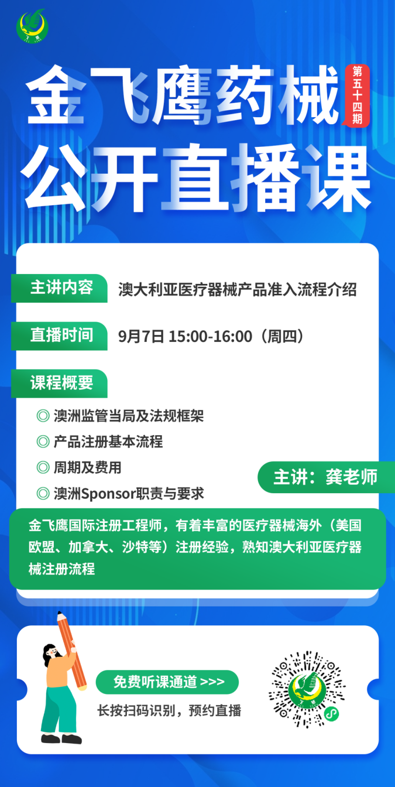 9月7日下午3點,大家熟悉的金飛鷹國際注冊工程師龔老師又來啦!她本人有著有著豐富的醫(yī)療器械海外(美國、歐盟、加拿大、沙特等)注冊經(jīng)驗,熟知澳大利亞醫(yī)療器械注冊流程,本次她給大家?guī)怼栋拇罄麃嗎t(yī)療器械產(chǎn)品準入流程介紹》,培訓(xùn)內(nèi)容包括澳洲監(jiān)管當(dāng)局及法規(guī)框架、產(chǎn)品注冊基本流程、周期及費用、澳洲Sponsor職責(zé)與要求等,有意向?qū)a(chǎn)品銷售至澳大利亞的醫(yī)械企業(yè)千萬不要錯過了哦!