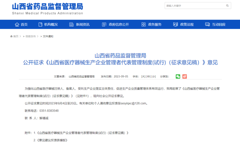 近日,山西省藥監(jiān)局官網(wǎng)發(fā)布《山西省醫(yī)療器械生產(chǎn)企業(yè)管理者代表管理制度(試行)(征求意見稿)》(以下簡(jiǎn)稱《征求意見稿》),并向社會(huì)公開征求意見。