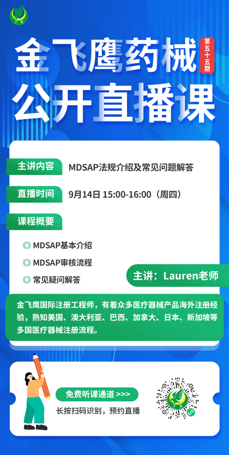 9月14日下午3點(diǎn),金飛鷹國(guó)際注冊(cè)工程師,有著眾多醫(yī)療器械產(chǎn)品海外注冊(cè)經(jīng)驗(yàn),熟知美國(guó)、澳大利亞、巴西、日本等多國(guó)注冊(cè)流程的Lauren老師,給大家?guī)怼禡DSAP法規(guī)介紹及常見問題解答》,培訓(xùn)內(nèi)容包括MDSAP基本介紹、MDSAP審核流程以及常見問題解答等,大家千萬不要錯(cuò)過了哦!