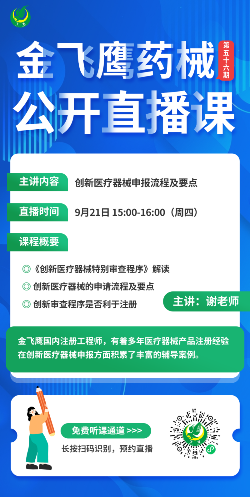 9月21日下午3點(diǎn),金飛鷹國(guó)內(nèi)注冊(cè)工程師,有著多年醫(yī)療器械產(chǎn)品注冊(cè)經(jīng)驗(yàn),在創(chuàng)新醫(yī)療器械申報(bào)方面積累了豐富輔導(dǎo)案例的謝老師,給大家?guī)?lái)《創(chuàng)新醫(yī)療器械申報(bào)流程及要點(diǎn)》,培訓(xùn)內(nèi)容包括《創(chuàng)新醫(yī)療器械特別審查程序》解讀、創(chuàng)新醫(yī)療器械的申請(qǐng)流程及要點(diǎn)、創(chuàng)新審查程序是否利于注冊(cè)等,大家千萬(wàn)不要錯(cuò)過(guò)了哦!