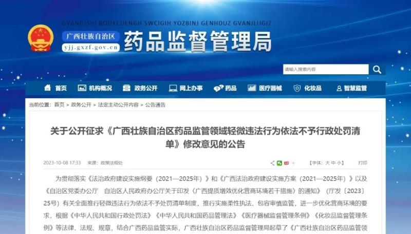 10月8日,廣西藥監(jiān)局官網(wǎng)發(fā)布《廣西壯族自治區(qū)藥品監(jiān)管領(lǐng)域輕微違法行為依法不予行政處罰清單》(以下簡(jiǎn)稱《清單》),并向社會(huì)公開征求意見。