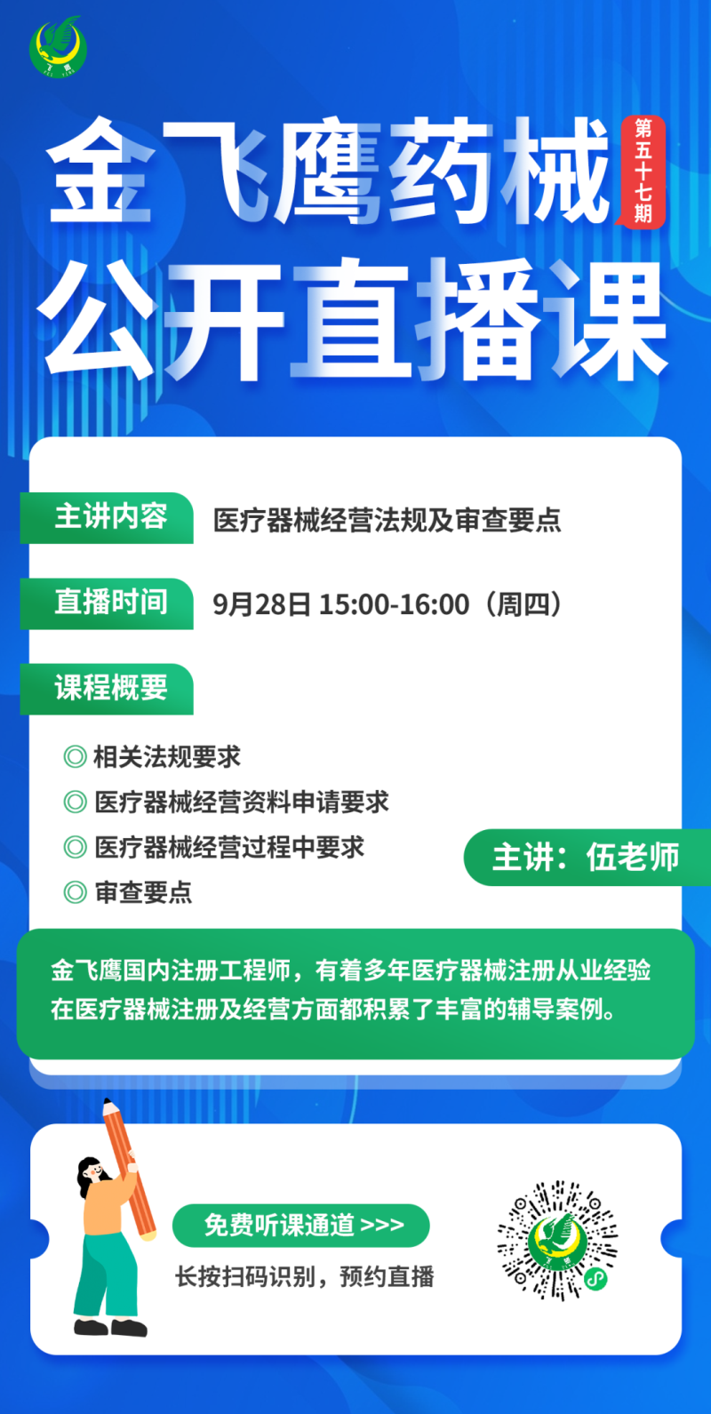 9月28日下午3點,金飛鷹國內(nèi)注冊工程師,有著多年醫(yī)療器械注冊從業(yè)經(jīng)驗,在醫(yī)療器械注冊及經(jīng)營方面都積累了豐富輔導(dǎo)案例的伍老師,給大家?guī)怼夺t(yī)療器械經(jīng)營法規(guī)及審查要點》,培訓(xùn)內(nèi)容包括相關(guān)法規(guī)要求、醫(yī)療器械經(jīng)營資料申請要求、醫(yī)療器械經(jīng)營過程中要求、審查要點等,大家千萬不要錯過了哦!