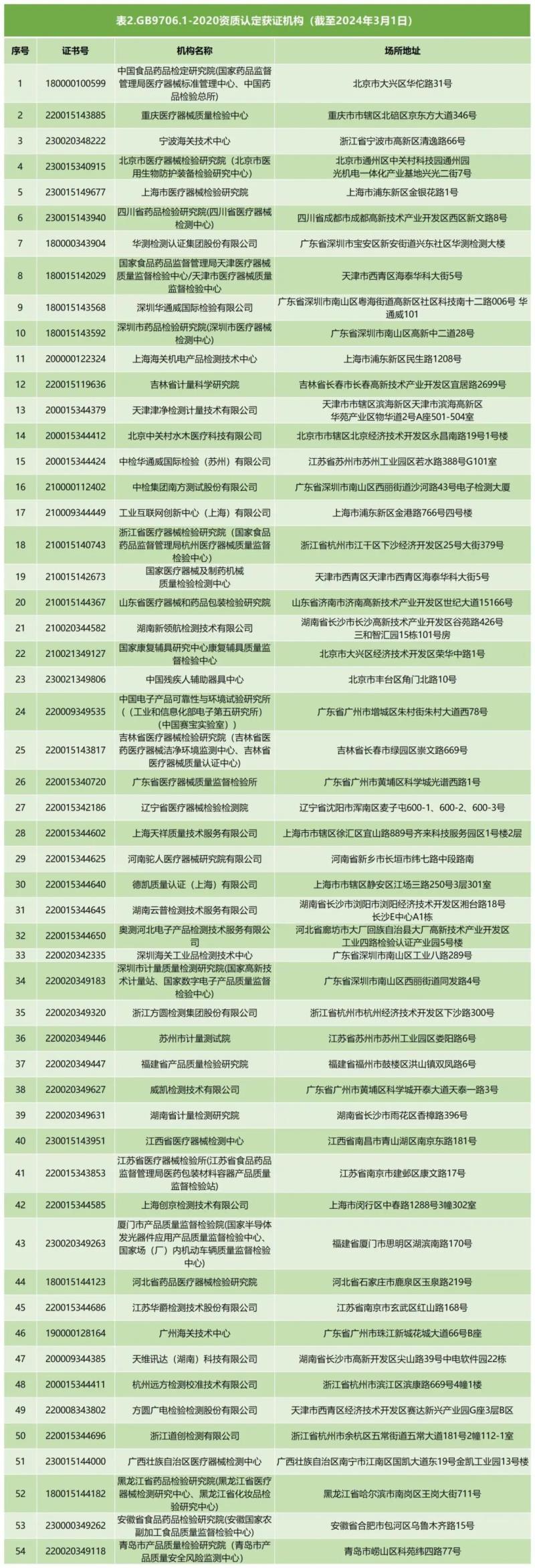 3月4日,中檢院官網(wǎng)公布了截至2024年3月1日,75個(gè)新版GB 9706系列標(biāo)準(zhǔn)檢驗(yàn)資質(zhì)認(rèn)定情況和GB 9706.1-2020、YY 9706.102-2021獲證機(jī)構(gòu)信息。我們從附件表格中可以看到,全國共有108家GB 9706.1-2020資質(zhì)認(rèn)定獲證機(jī)構(gòu),也就是說,可以承擔(dān)新標(biāo)的安規(guī)檢測工作,具體如下: