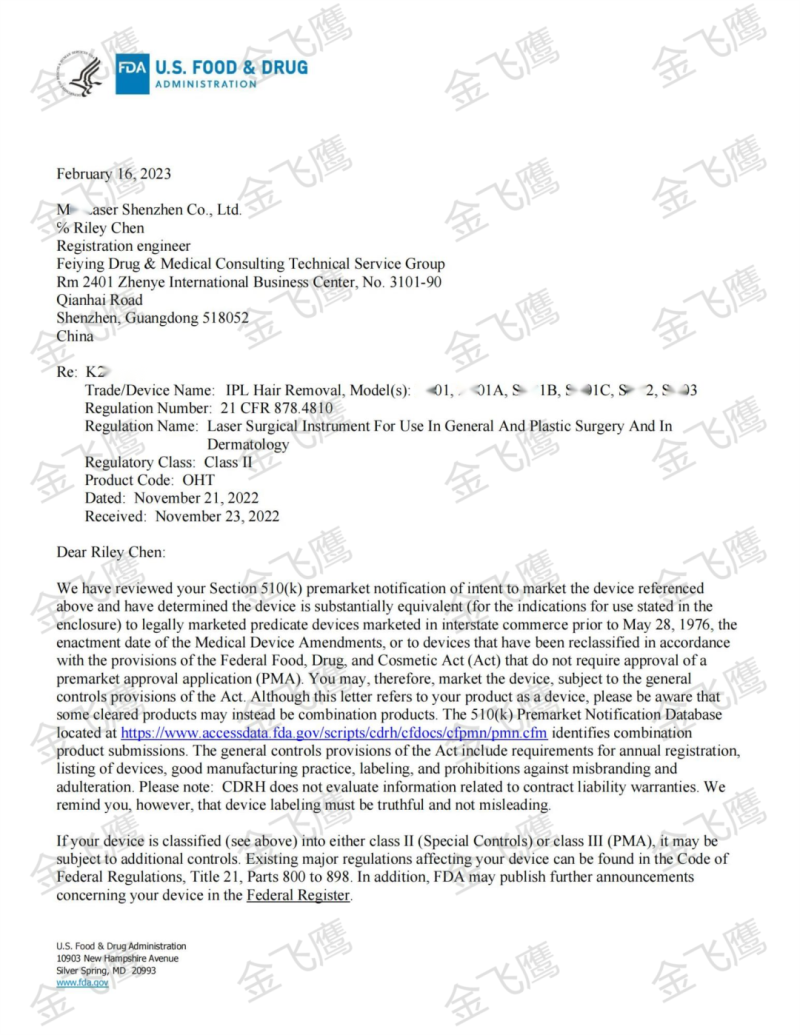 而說到IPL脫毛儀注冊,我估計不少企業(yè)首先想到的就是金飛鷹。當(dāng)然這并非小編王婆賣瓜,這都是一個個案例積累出來的!去年我們跟大家分享過不少IPL脫毛儀國內(nèi)外注冊案例,比如曾創(chuàng)下了單日取證15張(其中13張為脫毛儀)的“神話”般成績,也曾在一年中拿下了十多個IPL脫毛儀510(k)號,可能還有不太了解我們的朋友,這里就再帶大家回顧一下?