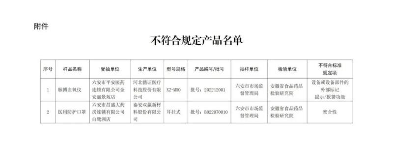 (一)脈搏血氧儀1批:標(biāo)示為河北循證醫(yī)療科技股份有限公司生產(chǎn),設(shè)備或設(shè)備部件的外部標(biāo)記 提示/報警功能不符合標(biāo)準(zhǔn)規(guī)定。 (二)醫(yī)用防護口罩1批:標(biāo)示為泰安雙贏新材料股份有限公司生產(chǎn),密合性不符合標(biāo)準(zhǔn)規(guī)定。