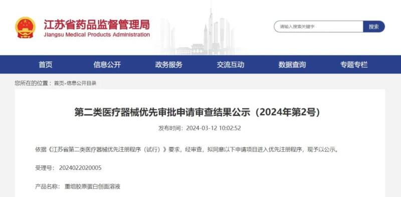 3月12日,江蘇省藥監(jiān)局公示了一期第二類醫(yī)療器械優(yōu)先審批申請(qǐng)審查結(jié)果,公示內(nèi)容顯示,這是兩款重組膠原蛋白產(chǎn)品(重組膠原蛋白創(chuàng)面溶液&重組膠原蛋白凍干纖維),申請(qǐng)人均為南京天縱易康生物科技股份有限公司,優(yōu)先審批理由如下:該產(chǎn)品符合《江蘇省第二類醫(yī)療器械優(yōu)先注冊(cè)程序(試行)》第四條中第(三)項(xiàng)規(guī)定的要求,即“列入國(guó)家或省部級(jí)科技重大專項(xiàng)、省部級(jí)重點(diǎn)研發(fā)計(jì)劃的醫(yī)療器械”,適用優(yōu)先注冊(cè)程序。