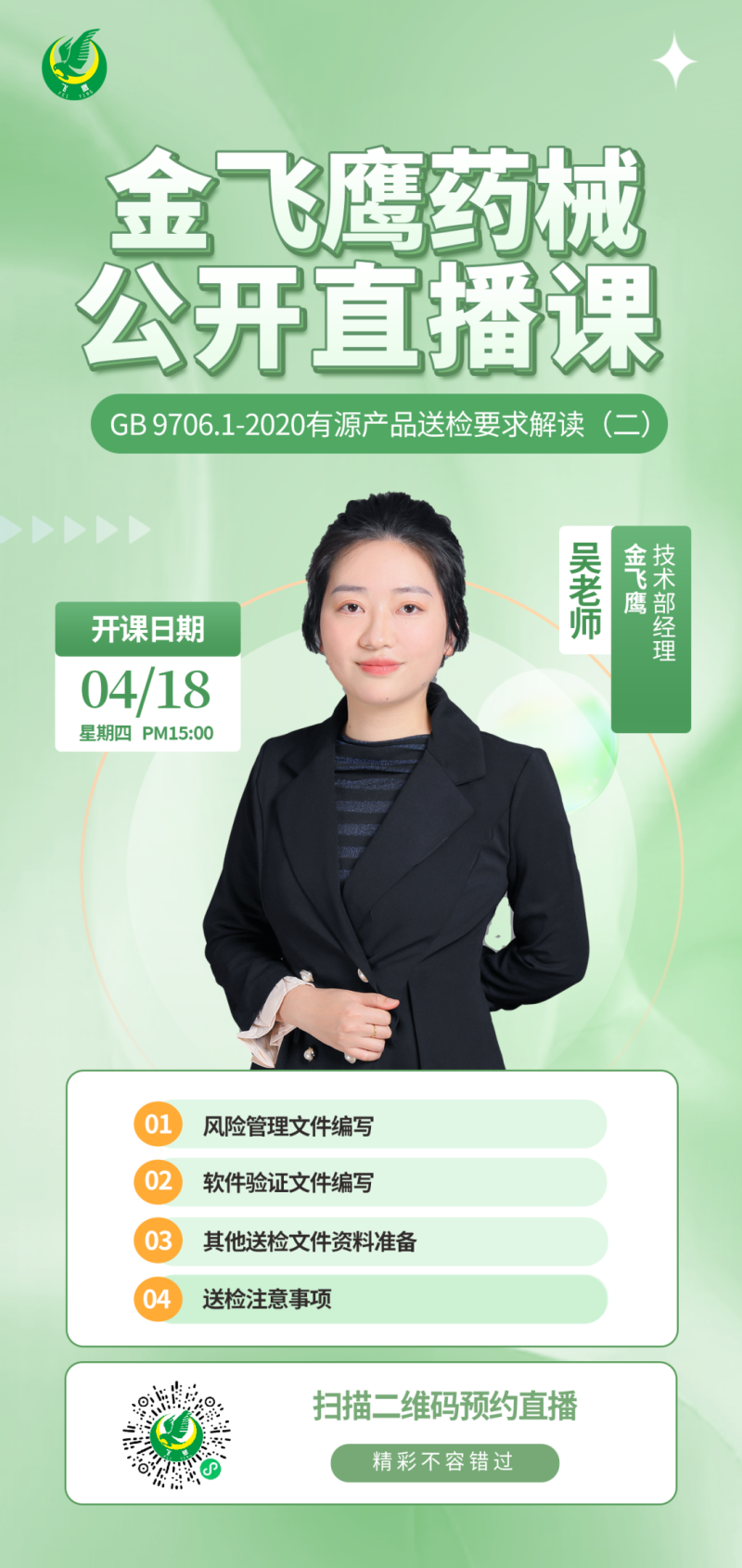 4月18日下午3點(diǎn),金飛鷹技術(shù)部經(jīng)理兼高級(jí)講師,有著近十年醫(yī)療器械行業(yè)工作經(jīng)驗(yàn),尤為擅長【有源產(chǎn)品】合規(guī)準(zhǔn)入上市認(rèn)證的吳老師,給大家?guī)怼禛B 9706.1-2020有源產(chǎn)品送檢要求解讀(二)》,培訓(xùn)內(nèi)容包括風(fēng)險(xiǎn)管理文件編寫、軟件驗(yàn)證文件編寫、其他送檢文件資料準(zhǔn)備、送檢注意事項(xiàng),有源醫(yī)械企業(yè)千萬不要錯(cuò)過了哦!