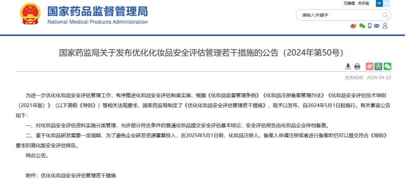 近日,國家藥監(jiān)局制定了《優(yōu)化化妝品安全評估管理若干措施》用于優(yōu)化化妝品安全評估管理,自2024年5月1日起施行。允許部分符合條件的普通化妝品提交安全評估基本結(jié)論,安全評估報告由化妝品企業(yè)存檔備查。