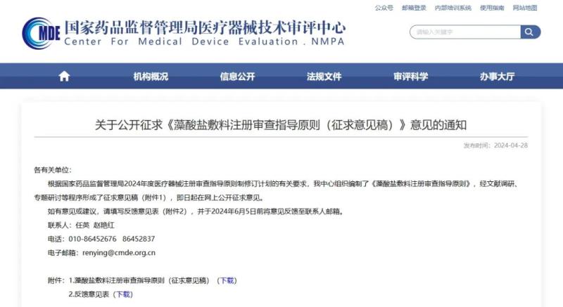 4月28日,國家藥監(jiān)局器審中心發(fā)布《藻酸鹽敷料注冊審查指導原則(征求意見稿)》(以下簡稱《指導原則》),并向社會公開征集意見。