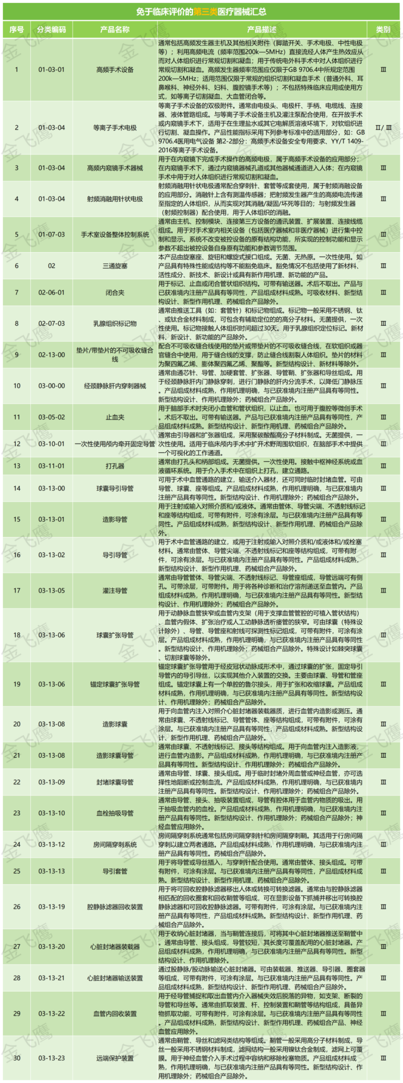 根據(jù)國(guó)家藥監(jiān)局發(fā)布的《免于進(jìn)行臨床評(píng)價(jià)醫(yī)療器械目錄(2023年)》,我們篩選出了免于進(jìn)行臨床評(píng)價(jià)的第三類醫(yī)療器械產(chǎn)品(共204類產(chǎn)品),部分展示如下: