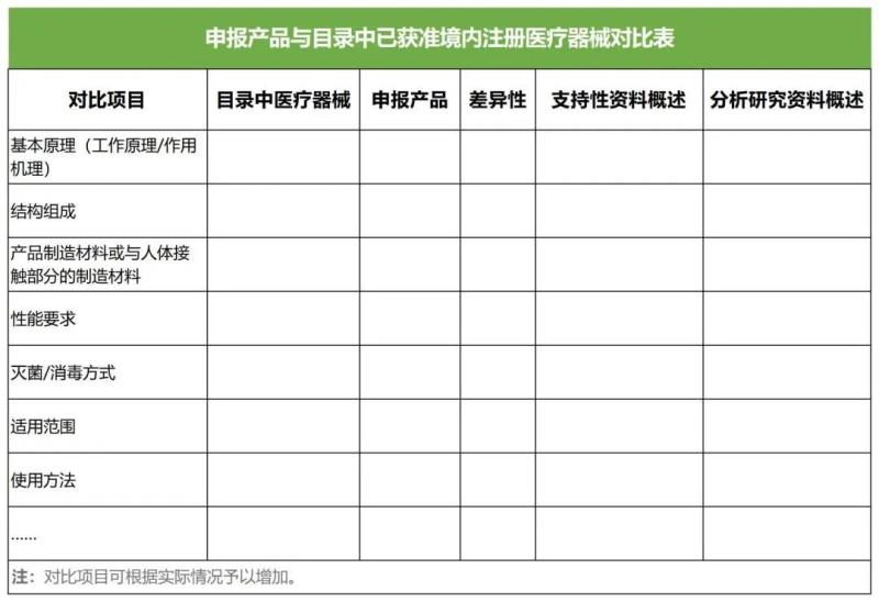 (一)提交申報(bào)產(chǎn)品相關(guān)信息與《目錄》所述內(nèi)容的對(duì)比資料; (二)提交申報(bào)產(chǎn)品與《目錄》中已獲準(zhǔn)境內(nèi)注冊(cè)醫(yī)療器械的對(duì)比說(shuō)明,對(duì)比說(shuō)明應(yīng)當(dāng)包括《申報(bào)產(chǎn)品與目錄中已獲準(zhǔn)境內(nèi)注冊(cè)醫(yī)療器械對(duì)比表》和相應(yīng)支持性資料。若經(jīng)對(duì)比,申報(bào)產(chǎn)品與對(duì)比產(chǎn)品存在差異,還應(yīng)提交差異部分對(duì)安全有效性影響的分析研究資料。二者的差異不應(yīng)引起不同的安全有效性問(wèn)題,即申報(bào)產(chǎn)品未出現(xiàn)對(duì)比產(chǎn)品不存在的且可能引發(fā)重大風(fēng)險(xiǎn)和/或引起顯著影響有效性的問(wèn)題。