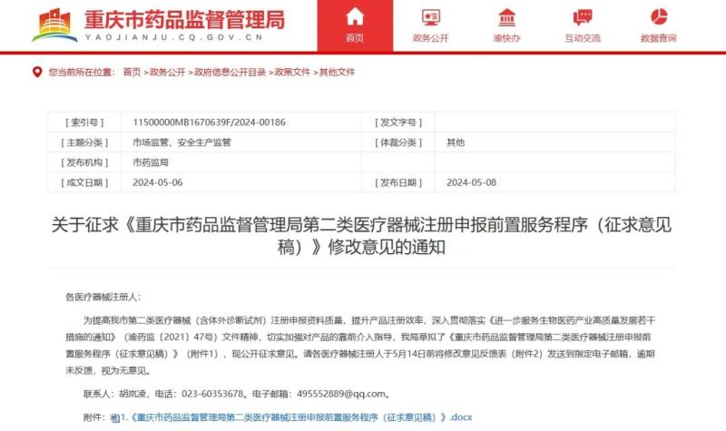 近日,重慶市藥監(jiān)局發(fā)布《重慶市藥品監(jiān)督管理局第二類醫(yī)療器械注冊申報前置服務(wù)程序(征求意見稿)》(以下簡稱《程序》),并向社會公開征求意見。