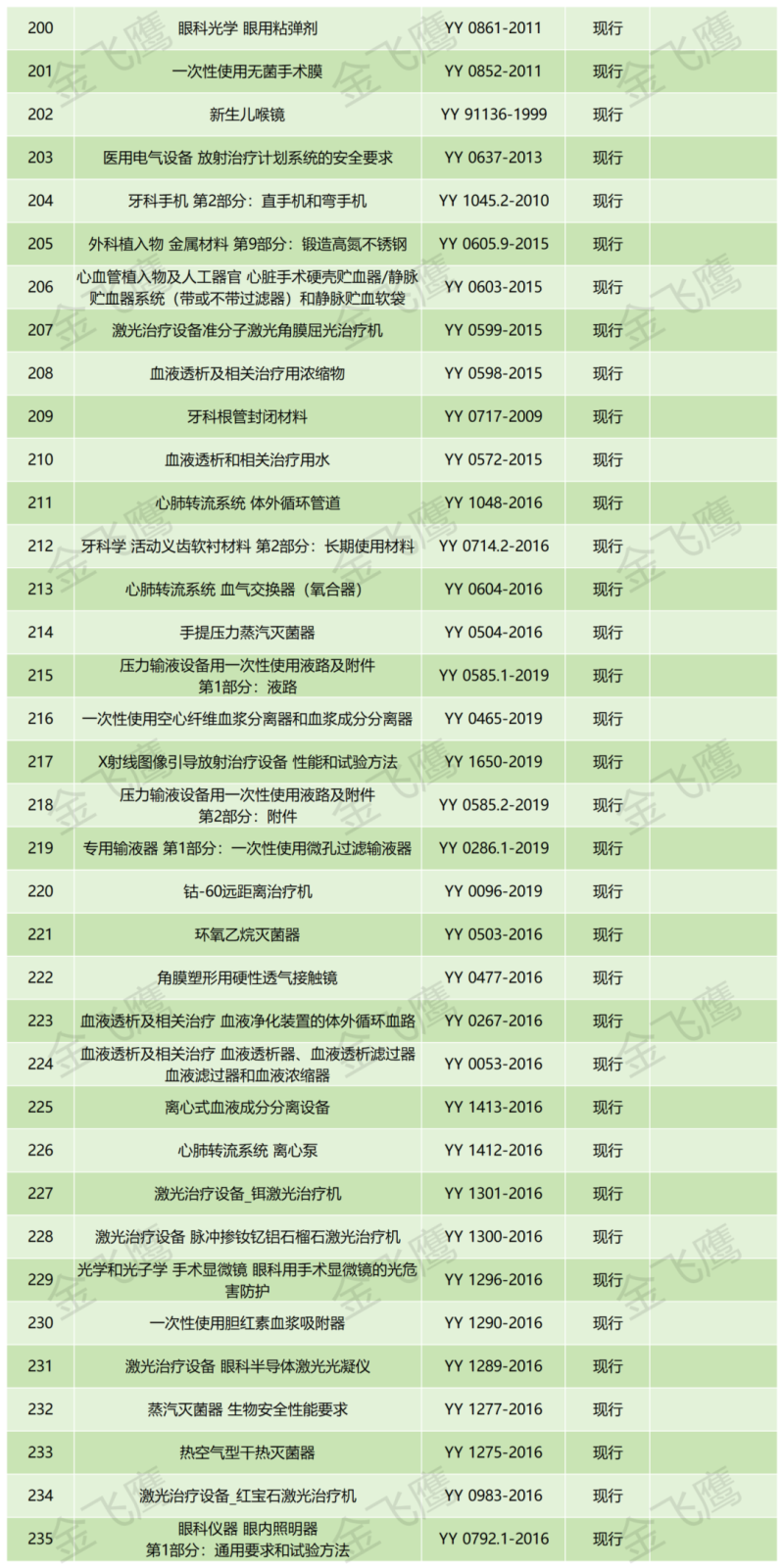 本期文章我們將中檢院官網(wǎng)公布的醫(yī)療器械強制性行業(yè)標(biāo)準(zhǔn)(即以YY作為編號開頭的標(biāo)準(zhǔn))匯總到一起,共計有235項標(biāo)準(zhǔn)(包括192項現(xiàn)行標(biāo)準(zhǔn)及43項即將實施的標(biāo)準(zhǔn)),部分展示如下: