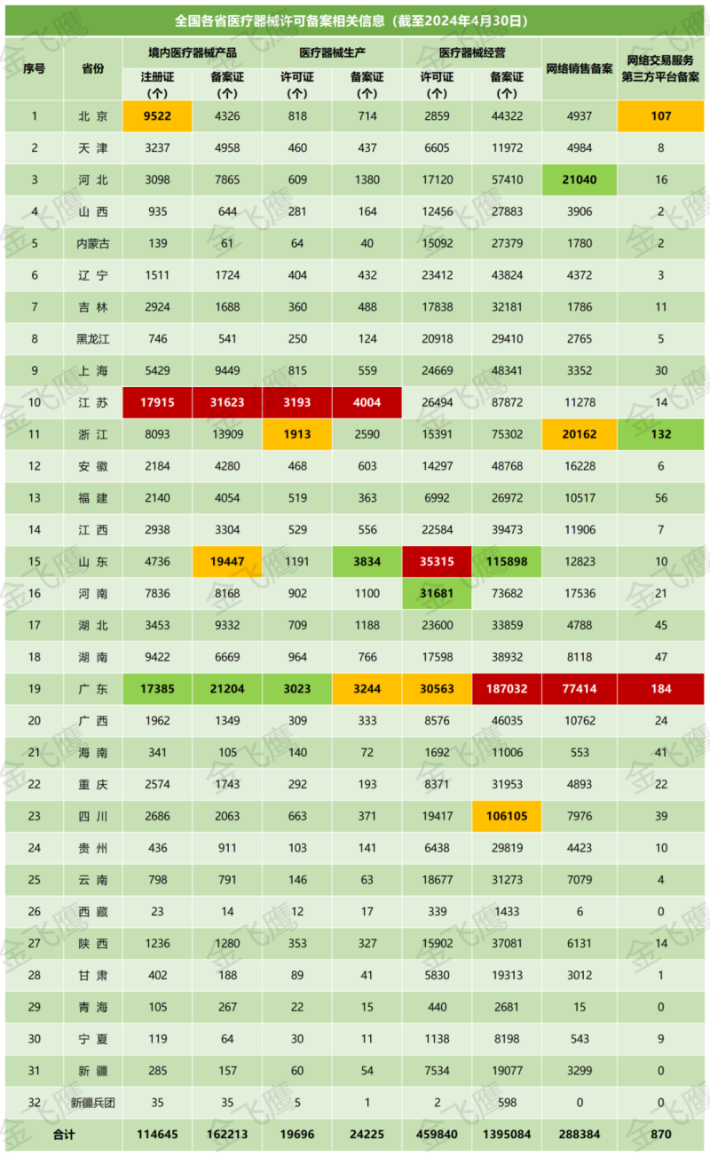 5月13日,國家藥監(jiān)局公布了截至2024年4月30日各省有效期內(nèi)醫(yī)療器械產(chǎn)品注冊備案、醫(yī)療器械生產(chǎn)企業(yè)許可備案等信息,老規(guī)矩,金飛鷹小編對此稍作編輯,標(biāo)注紅色、綠色、黃色的分別為前三甲。