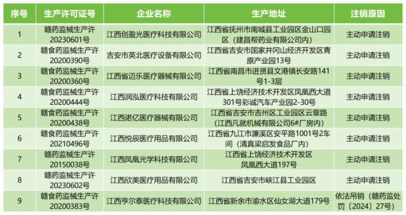 5月15日,江西省藥監(jiān)局官網(wǎng)發(fā)布一則醫(yī)療器械生產(chǎn)許可證注銷公告,公告顯示,該局已依法注銷江西創(chuàng)盈光醫(yī)療科技有限公司、江西省邁樂(lè)醫(yī)療器械有限公司等9家企業(yè)的醫(yī)療器械生產(chǎn)許可證,其中8家為主動(dòng)申請(qǐng)注銷,1家為依法吊銷,具體明細(xì)如下: