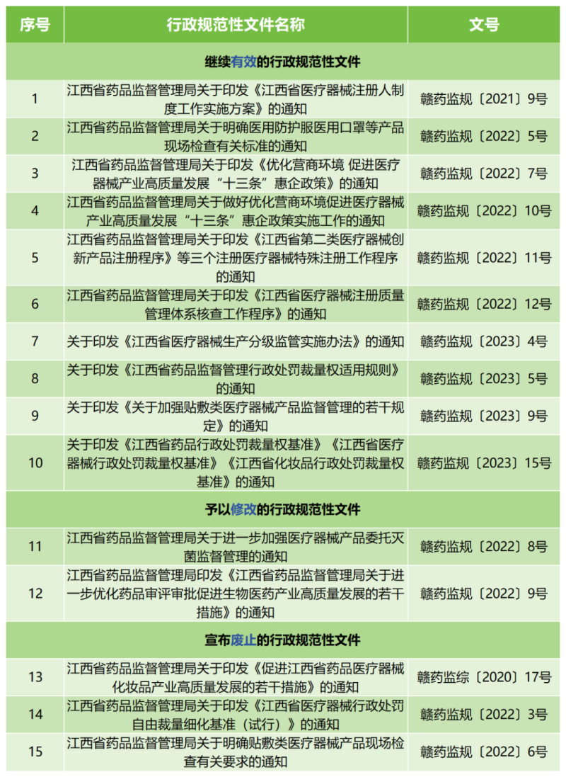 近日,江西省藥監(jiān)局發(fā)布公告稱,該局已對2023年12月31日前發(fā)布的規(guī)范性文件進(jìn)行清理。經(jīng)清理,31件繼續(xù)有效,4件予以修改,12件宣布廢止。我們將其中涉及到醫(yī)療器械的相關(guān)文件匯總?cè)缦拢?/span>