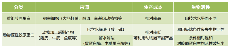 按照來源的不同膠原蛋白可分為重組膠原蛋白和動物源性膠原蛋白。重組膠原蛋白為非天然膠原蛋白,由基因工程技術(shù)合成,而動物源性膠原蛋白則從動物組織中提取。動物源性膠原蛋白生產(chǎn)成本較低且生產(chǎn)工藝相對簡單。而重組膠原蛋白擁有更高的生物活性與生物相容性、更低的免疫原性、更低的漏檢病原體隱患風(fēng)險、更好的水溶性、無細(xì)胞毒性以及可進一步加工優(yōu)化等特點,因此其應(yīng)用范圍更加廣泛,受到市場的強烈關(guān)注。