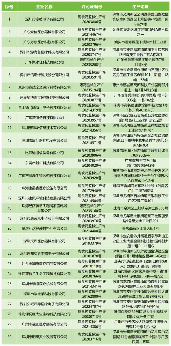 近日,廣東藥監(jiān)局發(fā)布通告稱,根據(jù)企業(yè)申請,該局于2024年4月依法注銷了深圳市度彼電子有限公司、深圳市倍斯特科技股份有限公司、比亞迪通信信號有限公司、深圳理邦實(shí)驗(yàn)生物電子有限公司等30家企業(yè)的《醫(yī)療器械生產(chǎn)許可證》。具體清單如下: