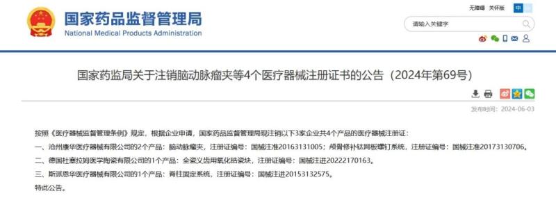 6月3日,國家藥監(jiān)局發(fā)布一則醫(yī)療器械注冊證注銷公告,公告顯示,該局已依法注銷滄州康華醫(yī)療器械有限公司、德國杜塞拉姆醫(yī)學(xué)陶瓷有限公司等3家企業(yè)共計4個產(chǎn)品的醫(yī)療器械注冊證,具體如下: