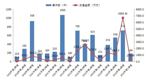 2024年第1季度共查處醫(yī)療器械案件184件,貨值金額279.99萬元,罰款金額461.38萬元,沒收違法所得金額25.73萬元,移送司法機關(guān)案件數(shù)1件,行政處罰案件信息公開數(shù)167件。