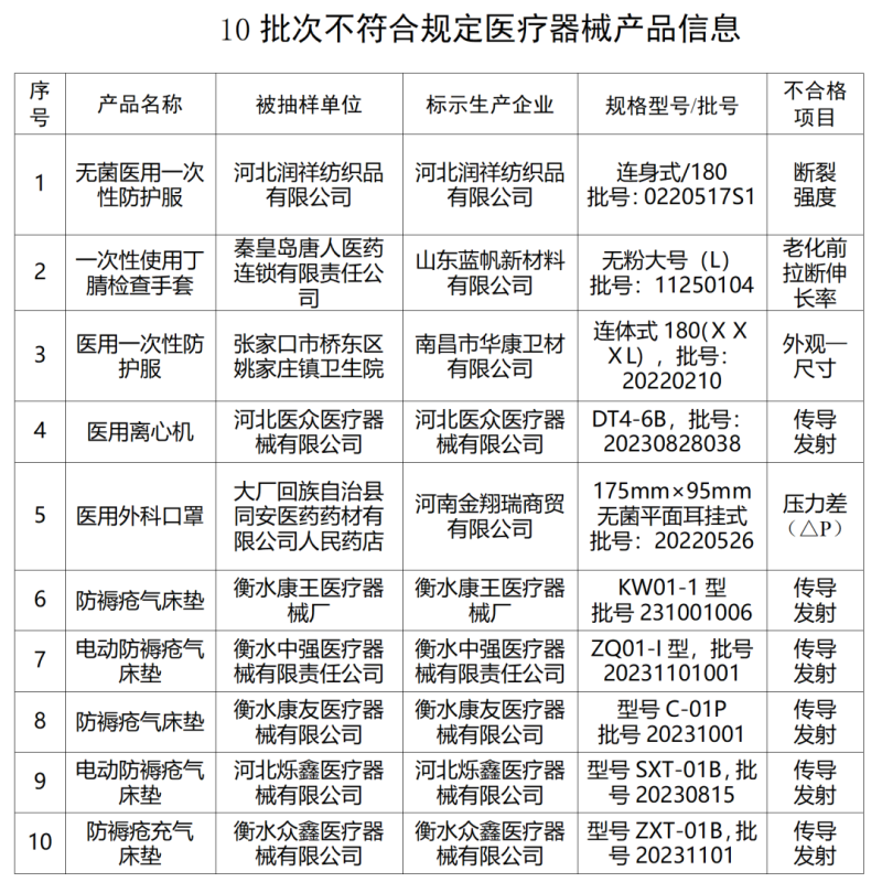 為加強(qiáng)醫(yī)療器械質(zhì)量監(jiān)督管理,保障醫(yī)療器械質(zhì)量安全有效,按照《醫(yī)療器械監(jiān)督管理條例》及《河北省醫(yī)療器械監(jiān)督抽驗管理辦法》有關(guān)規(guī)定,河北省藥品監(jiān)督管理局組織對2023年全省生產(chǎn)、經(jīng)營和使用等環(huán)節(jié)醫(yī)療器械進(jìn)行了質(zhì)量監(jiān)督抽檢,發(fā)現(xiàn)10批次產(chǎn)品不符合標(biāo)準(zhǔn)規(guī)定,并已依法分別予以查處,現(xiàn)予以公開。