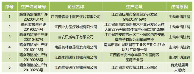 近日,江西省藥監(jiān)局發(fā)布公告稱,由于企業(yè)主動申請或有效期屆滿未延續(xù),該局已依法注銷了江西普森堂中醫(yī)藥飲片有限公司、江西業(yè)力醫(yī)療器械有限公司等6家企業(yè)的《醫(yī)療器械生產(chǎn)許可證》。具體明細如下: