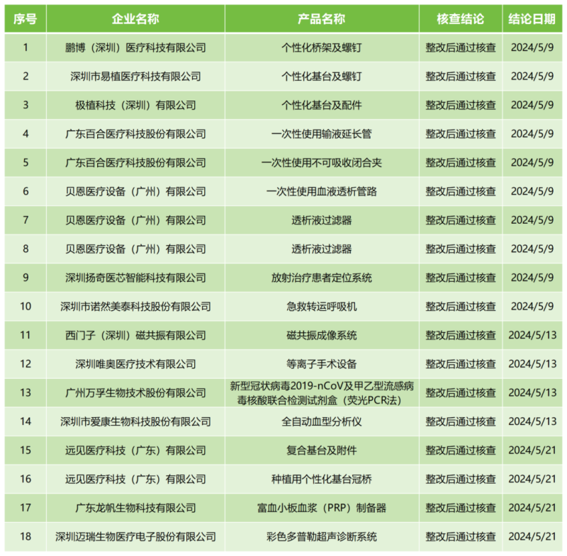 6月25日,廣東省藥監(jiān)局官網(wǎng)公布2024年5月醫(yī)療器械注冊質(zhì)量管理體系核查結(jié)果,包括西門子(深圳)磁共振有限公司的磁共振成像系統(tǒng)、深圳唯奧醫(yī)療技術(shù)有限公司的等離子手術(shù)設(shè)備、深圳邁瑞生物醫(yī)療電子股份有限公司的彩色多普勒超聲診斷系統(tǒng)等共計18款產(chǎn)品,均為“整改后通過核查”。具體明細見下方表格: