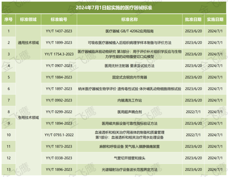自2024年7月1日起正式實(shí)施的共有13項(xiàng)醫(yī)療器械標(biāo)準(zhǔn),其中最值得大家關(guān)注的是YY/T 1437-2023《醫(yī)療器械 GB/T 42062應(yīng)用指南》,除此之外YY/T 0907-2023《醫(yī)用無針注射器 要求及試驗(yàn)方法》、YY/T 1896-2023《光譜輻射治療設(shè)備波長范圍界定方法》等,具體明細(xì)如下: