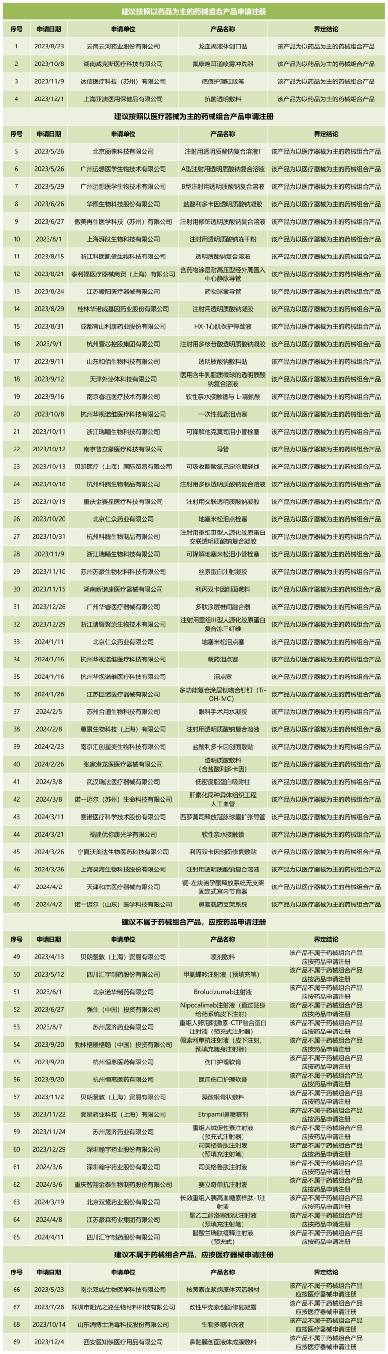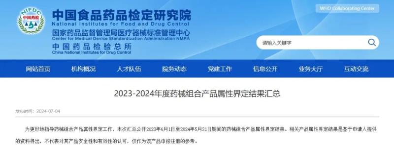 近日,國家藥監(jiān)局醫(yī)療器械標準管理中心發(fā)布《2023-2024年度藥械組合產品屬性界定結果匯總》,匯總公開了2023年6月1日至2024年5月31日期間的藥械組合產品屬性界定結果,具體如下: