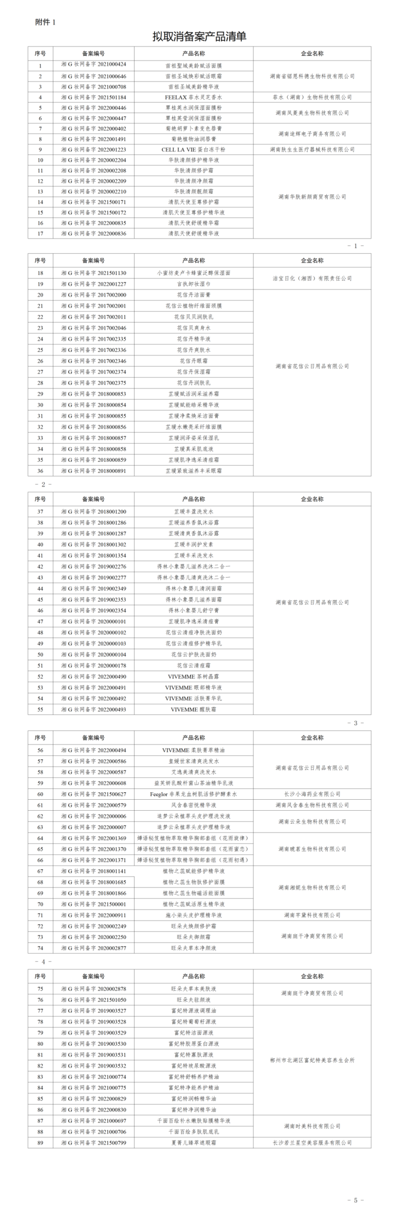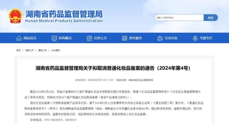 近日,湖南藥監(jiān)局發(fā)布《關(guān)于擬取消普通化妝品備案的通告(2024年第4號)》,其中提到,截至2024年6月30日,該省已備案的89個(gè)國產(chǎn)普通化妝品未按照規(guī)定提交年度報(bào)告。根據(jù)《化妝品監(jiān)督管理?xiàng)l例》《化妝品注冊備案管理辦法》等有關(guān)規(guī)定,該局?jǐn)M對該89個(gè)國產(chǎn)普通化妝品取消備案,具體產(chǎn)品清單如下: