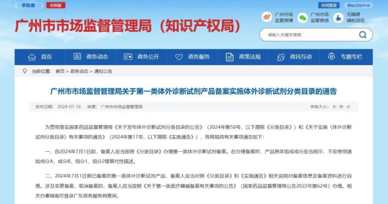 7月16日,廣州市市場監(jiān)督管理局發(fā)布《關(guān)于第一類體外診斷試劑產(chǎn)品備案實(shí)施體外診斷試劑分類目錄的通告》,其中提到,為貫徹落實(shí)國家藥品監(jiān)督管理局《關(guān)于發(fā)布體外診斷試劑分類目錄的公告》(2024年第58號,以下簡稱《分類目錄》)和《關(guān)于實(shí)施〈體外診斷試劑分類目錄〉有關(guān)事項(xiàng)的通告》(2024年第17號,以下簡稱《實(shí)施通告》),現(xiàn)將有關(guān)第一類體外診斷試劑備案的有關(guān)事項(xiàng)通告如下:
