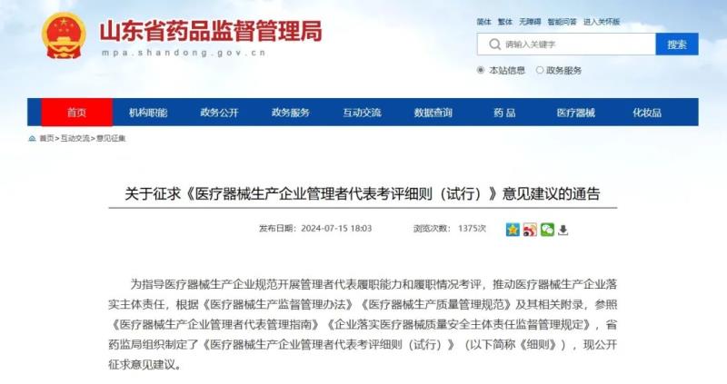近日,山東省藥監(jiān)局發(fā)布《醫(yī)療器械生產(chǎn)企業(yè)管理者代表考評細則(試行)》(以下簡稱《細則》),并向社會公開征求意見建議。