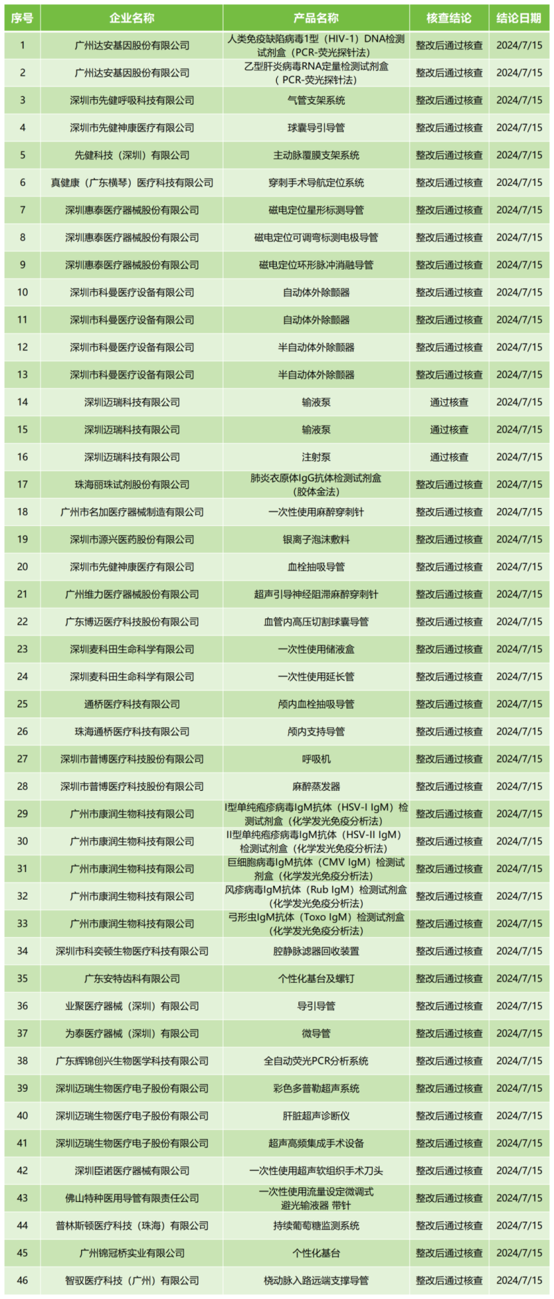 8月6日,廣東省藥監(jiān)局官網(wǎng)公布2024年7月醫(yī)療器械注冊(cè)質(zhì)量管理體系核查結(jié)果,包括深圳市科曼醫(yī)療設(shè)備有限公司的自動(dòng)體外除顫器、深圳邁瑞科技有限公司的輸液泵、深圳市源興醫(yī)藥股份有限公司的銀離子泡沫敷料等共計(jì)46款產(chǎn)品,其中深圳邁瑞科技有限公司的3款產(chǎn)品為“通過(guò)核查”,其余均為“整改后通過(guò)核查”。具體明細(xì)見(jiàn)下方表格: