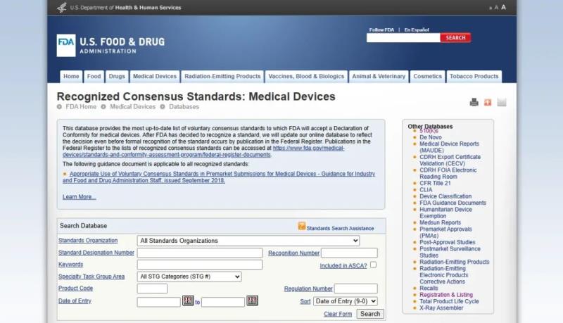 說完了定義及作用,那么共識標準應(yīng)如何查詢呢?對此,FDA有專門的數(shù)據(jù)庫Recognized Consensus Standards:Medical Devices。